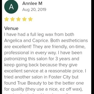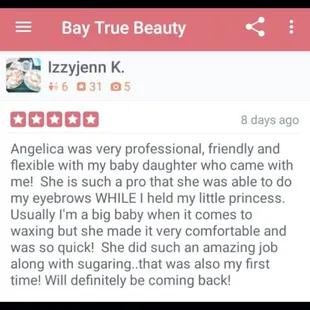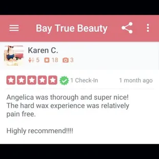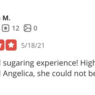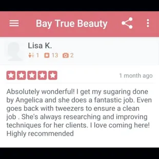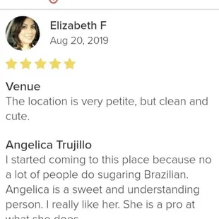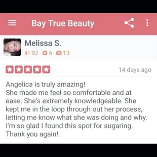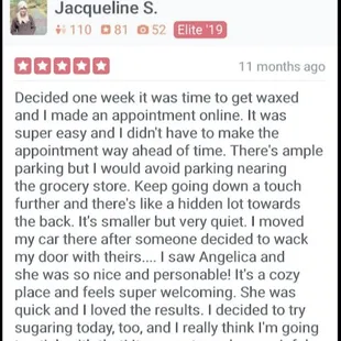 Such a good sugaring experience! Highly recommend Angelica, she could not be any sweeter!