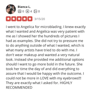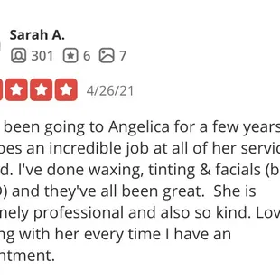 Absolutely love Angelica! She was the only person around that I could find who does sugaring. I've gone to her several times for different services and I'm officially a regular! She is so kind and makes you feel comfortable. The sugar she uses is locally sourced and the best I've ever had on my skin. She is very thorough and gentle. Love love her!!