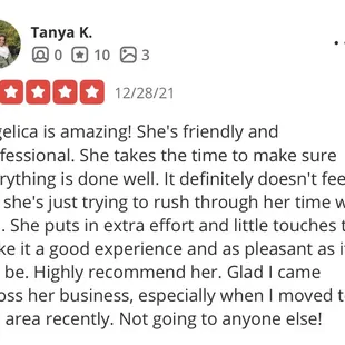 Angelica is amazing! She's friendly and professional. She takes the time to make sure everything is done well. It definitely doesn't feel like she's just trying to rush through her time with you. She puts in extra effort and little touches to make it a good experience and as pleasant as it can be. Highly recommend her. Glad I came across her business, especially when I moved to this area recently. Not going to anyone else!