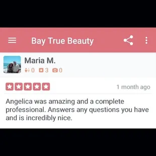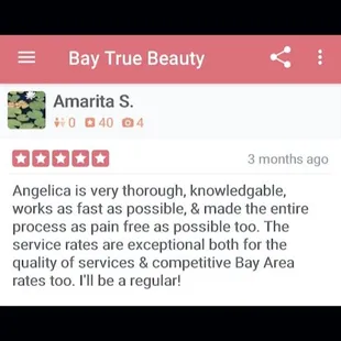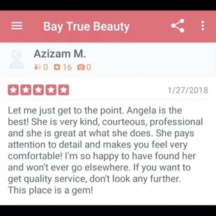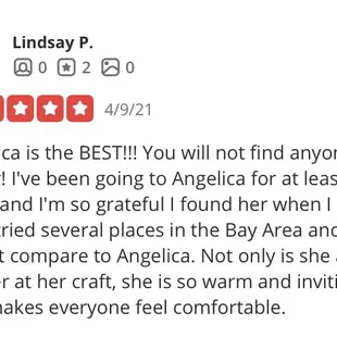 Angelica is the BEST!!! You will not find anyone better! I've been going to Angelica for at least 6 years and I'm so grateful I found her when I did. I have tried several places in the Bay Area and they do not compare to Angelica. Not only is she a master at her craft, she is so warm and inviting and makes everyone feel comfortable.