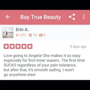 Angelica is the best sugar wax I've been too. And trust me, I've gone to one place before I found her, and 3 places after her because I moved to south sac and Rocklin was quite a drive. But now, I just schedule my appts on the weekend and the drive is smooth there in the morning. I love loveeeeeee how she really takes care of you during the sugar wax session. She doesn't rush, she takes her time. Gives you break if you need. Sometime she puts light hand pressure on after she strip off the sugar wax to relieve the after pain and she even takes her time to tweeze what she couldn't get ! Angelica is amazing. I will not be going to any one else but her. I read her reviews two years back and some one would travel from the bay to her. Well now I get it, I would too. Lol so I hope she ain't moving anywhere soon because I truly love how she makes her clients comfortable and takes care of them during the service. You will not be disappointed!