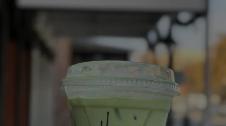 a hand holding a cup of matcha latte