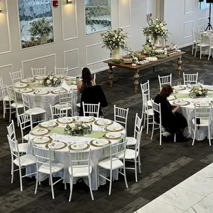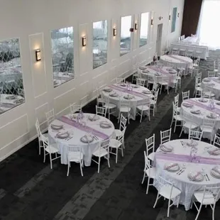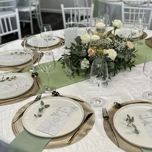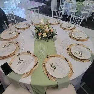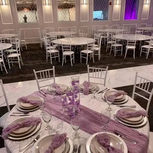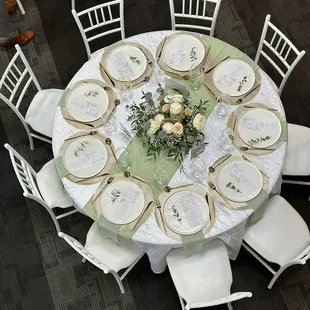Linen, runner and centerpiece (as well as setup) included in hall package. We added the place settings.