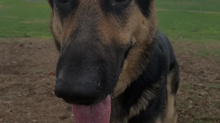 Dogs posing (with public restrooms and picnic tables in the background)