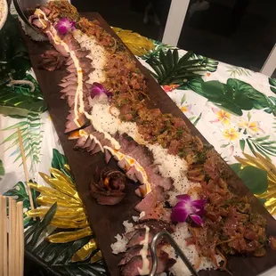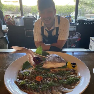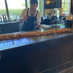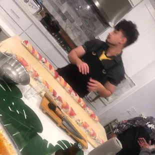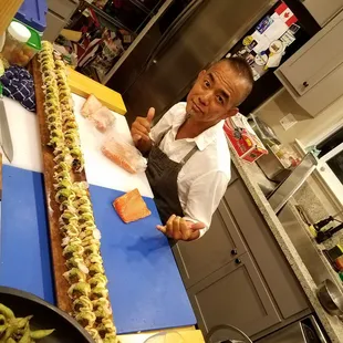 All you could eat Sushi!!! Attended one of Ed's Unique in-home Private Sushi Experience at our friends house Summer 2018. And what an experience it was! Totally blown away by his sushi skills and knowledge. He is so charming and personable. Enjoyed the tastiest ceviche with root veggie chips. BBQ Ribs-outstanding, sushi rolls 9 feet long, scallop shooters & so much more. We gorged till 3am!! So get your family & friends together turn on some music and get ready to Party. You're in for a night you will never forget! That's why he's scheduled out months in advance. Call him, tell him what you like, don't like make it happen!