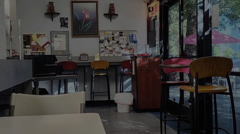 Interior. There are a few tables inside, as well as a patio.