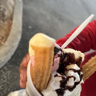 I've driven by these dessert truck a whole bunch of times, but ever stopped. My buddy had told me about it and then one day when I was craving a churro I ended up coming. The stuffed churros are priced at 2:50. They can be stuffed with either caramel vanilla cream or strawberry. I ended up getting the caramel which was delicious. I also tried the ice cream turtle which comes with scoops of ice cream and two churros. Everything is made to order so it is nice and warm.