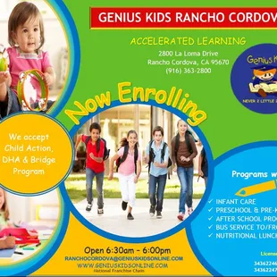 I have NOTHING but GOOD NEWS about this place. My kids have been going here ever since it switched management and companies to Genius Kids, it is very well organized, very caring with the kids, great work with potty training, works really well with behavioral children, very understand when it comes to children's disabilities, and medical issues. There school is very interactive and know they are not there just to play, but they are their to learn as well. Staff is very GREAT aim communication I can honestly say in my opinion this is a great place to place your kids at for care, I don't trust everyone with my children.