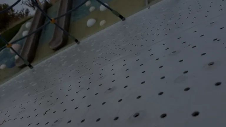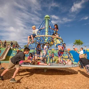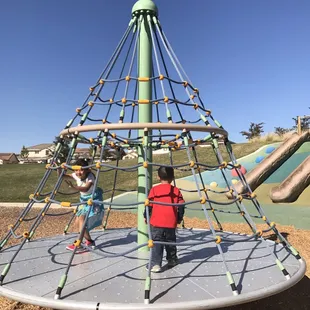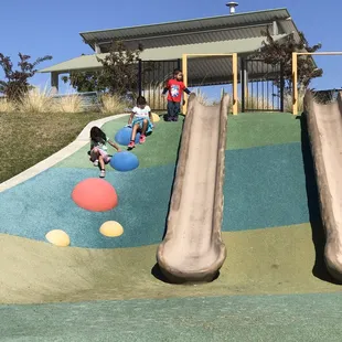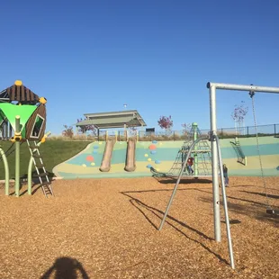 A playground with some unique features. The slides on the hill were interesting. My kids particularly enjoyed the pipe slide. The play structure houses had cargo nets for floors which made it more challenging. There was also a nice round circular swing. Overall a different change of pace and layout for a play ground. There was also an area for 5 and under. Nice neighborhood park.