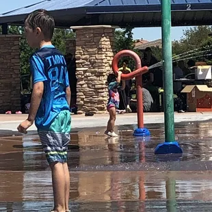 Love this park - water feature is great - but remember to keep shoes on your kids. That rubber gets hot if they walk off and so does the pavement. Saw a kids feet melt to the ground and had to have paramedics!