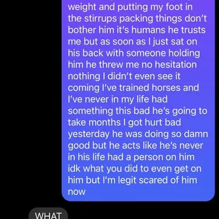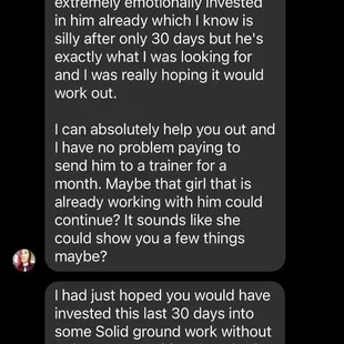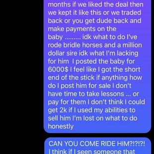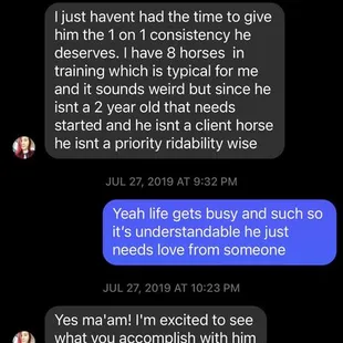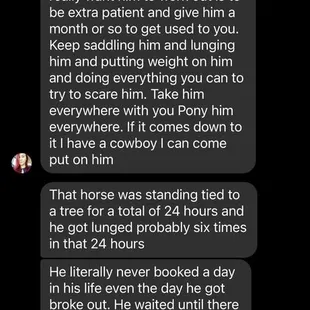 My horse lost significant weight and muscle mass when he returned. Not happy with how he was treated, not to mention they lost my new halter and lead rope. Then threatened me with "taking her work equipment that she uses every day" after HER employee gave me a halter and lead rope to get my horse home.