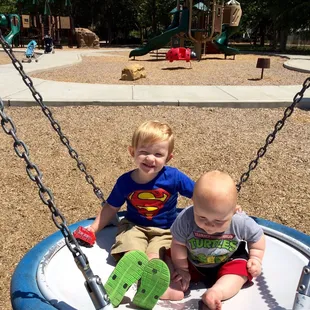Multiple playgrounds, large webbed climbing area, swings, and mister area! No shade over park, but shaded seating on perimeter!