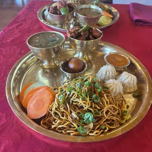 Noodles, egg rolls, fried chip thingies and potstickers.