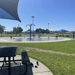 Very cute little park. There is a play structure, splash pad and plenty of grass to set up some nets and play soccer. There are 4 covered areas circling the splash pad so if you can land there, you're in good shape. There are two parking lots on either side of the park where you can park your vehicle and very kept and clean bathrooms by the softball field. I also noticed a good area for walking. Likely about a mile or so. I brought my son here on a Monday morning during summer vacation to run out some energy and have fun in the water. It's always a younger crowd of kiddos this time of day (10am-12pm) but he still has a blast and makes friends!