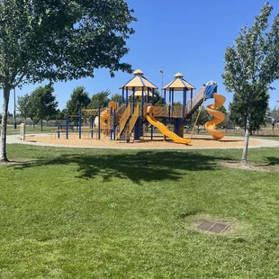 Nice park with good parking area. This park has big green fields. Came on Sunday morning only few people playing in sport fields.Their parking is nice since it requires a little walk to the playground which is safer for little kids that like to running around since it's not so close with the playground. Playground is pretty good size and has lots of steps structure to play. The swing is not too close to playground more like few walks away. I personally like it better so when the kids playing swing is not too close to the one running around the playground is safer so they don't bump to the people playing swing. They also has water park.water park usually only open on summer time.They do have few picnic tables not much. So having big party in park probably this park is not so much table compared to harry crab park or granite bay area park.If u come early morning during cold season slides definitely is wet. Saw one homeless guy digging through the trash can walks around. As long is safe and clean this park is not bad too bring the kid to play.