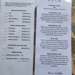 Menu reserved tasting $15