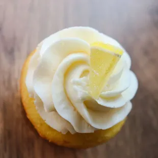 a cupcake with whipped cream and a lemon