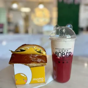 The concept is awesome. I was so obsessed with Korean egg sandwich I ate them daily during my visit to Seoul so I was really excited to try this place out.I did not realize this was inside a Bober tea spot . I think it's a smart idea and I want more restaurant and drink spot to share kitchen like this. It's so convenient! Does the sandwich. I think it's interesting that they basically slice down a thick toast and stuff the filling. That being said you're gonna get a big bite of toast at the end. The filling was a bit too sweet for me. I will need to try other sandwiches to be sold. Also this is a messy meal I keep on dropping bits on the table Drink wise I really like the pandan foam. It works on a lot of different drink base so good! I get my tea non sweet bc the foam is enough sweetness. I like ordering from kiosk and they did come out to inform of a special promotion but she spoke too fast and the sandwich took about 15 min to get made so just an FYI if you're on a time crunch for lunch - order ahead.I'm sad that I can't find Momo Korean egg drop on delivery app though. It's not even too far from my spot. Til next time.
