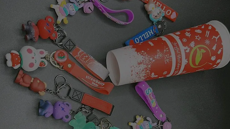 The cutest keychain from our Surprise Cup and the Half Moon Strawberry Smoothie underneath the Surprise Cup