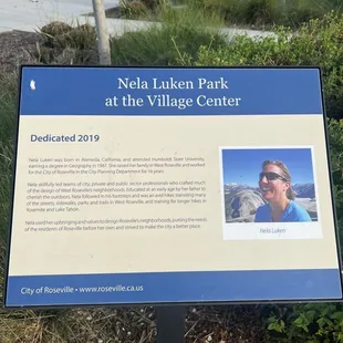 Nice Park but no Shade, WestPark AreaThe WestPark community in Roseville is growing rapidly... Nela Luken is one off the parks in the area. It is located on Pleasant Grove Blvd between Village Plaza Drive and Village Center Drive. The park is located in a nice central spot that is adjacent to a few businesses including MoJoe's coffee shop, Kitchen 747 for casual American dining and a gym (F45 Training). If you see any of these businesses you are very close to Nela Luken Park off of Pleasant Grove Blvd.The park is well maintained with a lot of grassy area. There is a section with metal picnic tables, can't move the tables around as they are secured to a cement pad. With our triple-digit summers this should've been a covered area. There is not one shady tree near that seating area. All the trees are young and not big enough to draw shade. The park was named in honor of Nela Luken, a former Senior Planner at the City of Roseville. There is a playground but whoa! the top of the slide is pretty high up there. It would be a bit scary for a young child to be on top that tall structure. There are also bathrooms in the premises. Anyway... I come here for the food trucks on Wednesdays. They usually come in fours and they would park alongside the parking area. Usually there are three meal trucks and one dessert truck on rotation. Review #2586