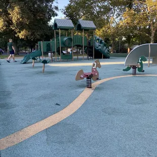 We really enjoyed this park! They have two structures that are away from each other. One is catered toward younger kids. The other is larger, for the older ones. Both have infant swings, which is nice. This review is about the smaller, toddler area.I love the turf and how open the space is. It's nice that there is a shaded picnic area nearby too. They have a rocking horse and dinosaur which my son really loved. The structure itself was cute, but I wish it had more interactive sensory play. They had a mini rock climbing area. It would be nice if it wasn't metal because it was sooo hot to the touch. What I didn't like is that is literally smelled like poop. Human poop. There were also more transients. I also wish the structure had some shade near it. We will be back to check out the other side of the park!