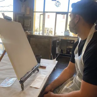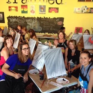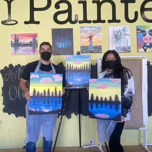 DATE NIGHT!!! (Friday night 6pm-8pm) Fun, creative, and like BOB ROSS SAID " we don't make mistakes, just happy little accidents." The Alpha Hannah was awesome and she was the artisan of the night. I was able to easily follow her user friendly instructions and directions. THANK YOU HANNAH!! The whole crew was awesome and laid back. It was easy to sign up for the classes online and all we had to do was give our name at the door and pick a seat to paint. I suggest getting there 10-15 early to pick your seat because it will fill up fast. We got there like 10 minutes before the actual "start time" and chose two seats right in front. Wine- you can purchase a cup of wine at the front deskEveryone is welcome no matter your skill level, but please don't be like Monica Geller ( FRIENDS show) and pretend to be a newbie when you are a professional , that's just not fair lol