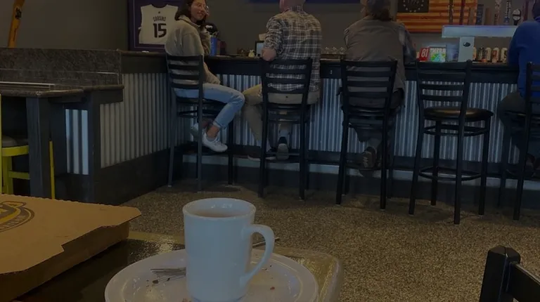 Small, obscured sign where one orders & pays before a take-out or after they've eaten in the bar.