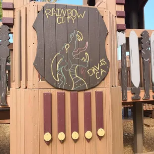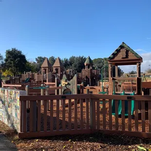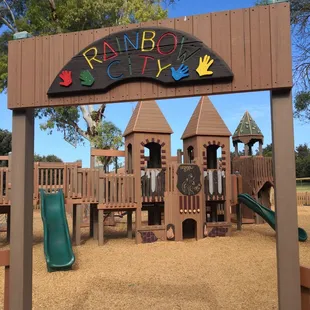 I remember when Rainbow City was new in Davis, and it was a treat to be able to bring my little one to the area to play here too. Like the other review stated, I think this is a good spot for probably elementary-aged children more than toddler/preschool age. We visited during the summer too, and one of the summer camps had children running all around the place. It wasn't the experience we were hoping for when we planned a play-date with two not-quite-2-year-olds. Luckily, there is a great smaller park just up the hill that seems much more fit for younger children, like ours. We ended up going there to play.Rainbow City does have a good assortment of structures to climb and play on. They are wooden, but not splintery. There are boats, towers, etc. Lots of room to run and play a good game of hide-and-seek. The area with the swings has mulch on the ground and the wooden structures are surrounded by sand. There are also LOTS of picnic tables across the bike path near the Art Center and several wooden benches within the playground area too.Overall, I think this is a great park for big kids -- maybe we'll try again in a few years!