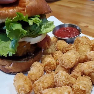 Regular hamburger and tots, and the blue cheese burger and tots