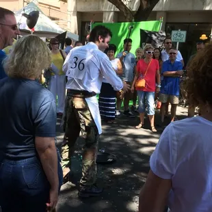 Bastille Day is a must for the francophile in me. And given that it was at my favorite intersection in midtown (18th and L), it was a no-brainer. And what a fun event! We got there around 1p.m. and the first person I saw was Michelangelo S, in line for food. We followed him over to the yelp booth, spun the yelp wheel for our prizes (fingerless mittens and a beer glove), and as we were getting ready to move on, found that we were in the best spot to watch the first waiters coming around the corner in the Waiters Race. This is an annual event on Bastille Day here in Sacramento: waiters from restaurants in the area compete to carry a tray with two water glasses and a bottle of perrier without spilling. They fast walk to the finish line, and are judged on how damp the tray is, whether they dropped the glasses, etc. The winner this year was a server from the Grange Restaurant... congratulations! I loved the awards: metal men holding a tray and bottle/glasses with a little french mustache. Right after the race, the performers from the California Stage theatre put on a mini performance of their current show, Marat/Sade, right there on the street. The performers were beautifully dressed and it was a treat. See here for their production details: http://www.calstage.org/ai1ec_event/maratsade-2/?instance_id=We wandered around, checking out all the local vendors who had their booths and samples for us to try (The Rind, Zocalo, etc.), got our pictures taken at the Kissing Booth hosted by Giggle and Riot, ending up at Capital Dime to catch the end of the World Cup. It was a great afternoon. Looking forward to celebrating Bastille Day again in Sacramento next year!