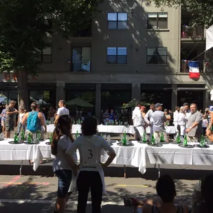Free event! There were complimentary samples from various Handle District restaurants. Aioli Bodega Espanola was the most generous with several different items including profiteroles, even though it's a Spanish restaurant. It was hot outside, but there were also plenty of beverages to help people cool down. The main event was the waiter's race. I'm not sure who won as it's not just about who finishes first, but the waiter isn't supposed to spill water either. Kids also raced with water balloons. There was a photo booth. Or you could take a picture with the mini Eiffel Tower that was erected. It was a great way to spend a Sunday. Merci!