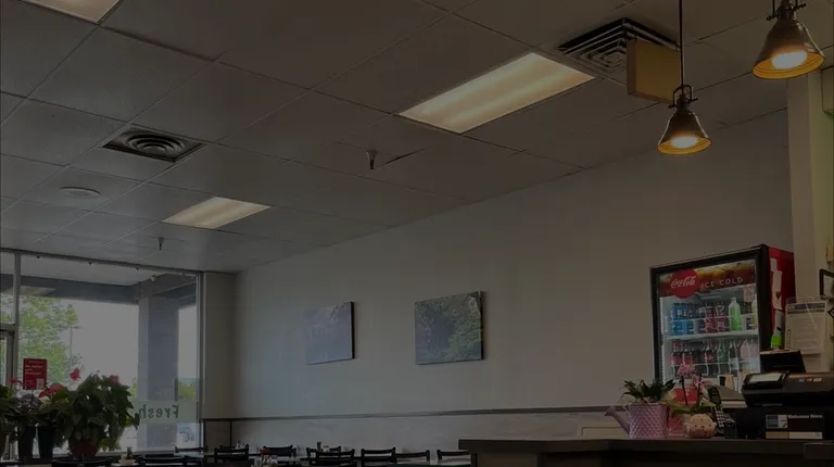 a restaurant counter with a menu on the wall
