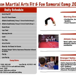 This is my son's second year at Samurai camp. He absolutely loves it and comes home tired everyday! I decided to try it out because he was being picked on by kids and I wanted him to make new friends and try something new. I love that they do stretching, games, art projects, and self defense. By the end of the first week he had already learned a lot of karate and asked to go back. After the second week I decided to do all the sessions and ended up enrolling him in the dojo the last 2 years. He still loves camp and is growing to be a sweet, strong, artistic, kind, and respectful young boy. If you ask him, his favorite part of camp are the games and karate. What a great summer program! Definitely worth the money, plus it's an all day camp so I don't have to find a sitter to pick him up while I'm at work.