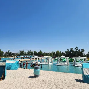 I rented a floating cabana. One: that cabana is hard to get on to. There is a singular step where only on foot can rest in. No handles to help yourself up and the cabana it self its slippery!! Caution: very slippery!!! When you have multiple adults it is hard to stand up as the cabana is moving. The drapes were broken, so we had to improvise as I was staying in the cabana and not participating in any activities. In white as white can be. I needed those drapes. I also don't like how I had to wear a life jacket in 4 feet of water while trying to get into the cabana. We all had a hell of a time. The boys had fun jumping off the back of it and trying to push each other off the cabana. Then they went on the Aqua Park it self and had a great time. Quite challenging. The hamster ball they didn't like because the sand was sharp and that was what was in the ball. Scrapped them up.There are catfish in the water, so beware. Catfish are dangerous and we got yelled at by the lifeguard because one came next to me while my friend went to kick it away (just slapped water, not to kick it) and the lifeguard got upset with us. Food was good and overall the atmosphere was full of laughter and was good.We won't be coming back.