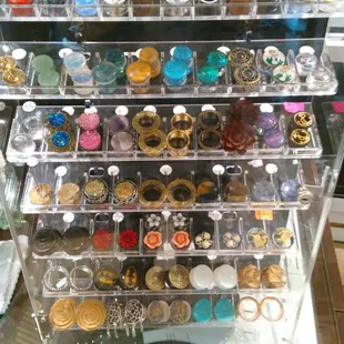 I want to love this place, super cheap ... But I'm learning you get what you pay for. I have been here twice. First got a hoop nose ring, happy with that. Came back for a diamond circle nose ring, a square diamond one (that I was super excited about) and a plug (clear) again prices were great. HOWEVER, before I even got home, I took the circle nose ring out to show hubby, and bam there was no diamond in it... Kind of frustrating, so the next day I returned it, lady was very nice and replaced it. Well today (2 days later) I'm wearing the square diamond nose ring ... I go to do my make up.....And the diamond is gone. Cool. So unless you don't want the studs in the jewelry, you're all set to make a purchase here. However I like bling, and I like it to stay intact and not walk around like a doofus with no diamond in my nose... Just the awesome setting, Super sexy. :| not. Good luck, the hoop works out nicely so that's why I give it one star.