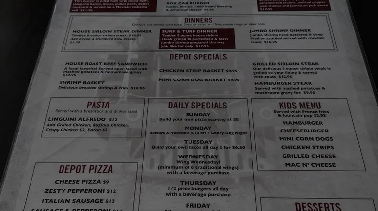 Went to the depot Friday night. Had the fish dinner deep-fried it was delicious. Had a wonderful waitress good food good service.