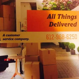 Very happy with All Things Delivered. I was in a bit on a pinch for loading my stuff to move and they were able to accommodate last minute. Very fast and hard working guys. Would recommend them.