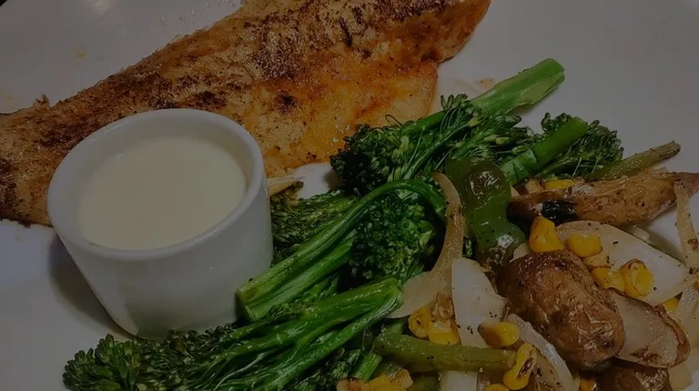 a plate of fish and vegetables