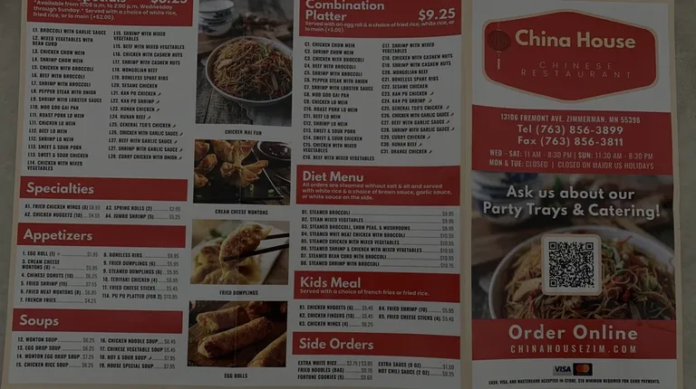 We have been regular customers of China House Zimmerman since it opened. Our favorite dishes are: Black Pepper Chicken and Curry Beef. We also regularly get the egg rolls, and mix in Diet menu #4 white meat chicken/ broccoli with garlic sauce. Just recently branches out with Hunan Chicken; was fine but like my regular choices better. Next will try Szechuan Chicken and Mongolian Chicken.
