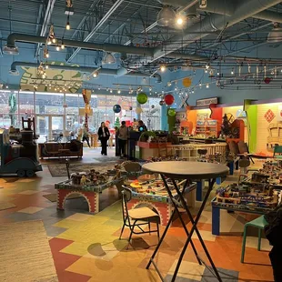 Great place to take kids. It is nice that the new location is inside Union Depot (an actual train station). I will forever miss the old location in Merriam Park and that set up, but this is still worth a visit. New owners and a different setup than the original (now it is pay to play and has been with the new owners, which makes sense as the original owner had the store as a passion project in addition to his regular job working in TV/film).The setup is unique in the store with a small section by the register as you walk straight in, and the pay to play area if you take a left before that. There is little nooks and crannies in the back with party areas and a small inflatable bounce house. $10 for kids to play if I remember right and a smaller fee for adults. Fun place and worth it. Not the same magical place I took my kids to and had a few birthday parties at, but that is ok. My kids are a bit older now, so I don't think we will pay to play much these days, but love this as an option for people with younger kids and a place for us to stop in and shop