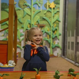 Has baskets, watering cans, fruits and veggies. You can put the fruits and veggies on the corn stalks, apple trees and carrot pots.