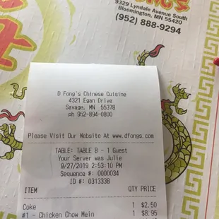 Same great food as David Fong's in Bloomington, the Fried Rice is the best I've ever eaten, tried and loved the Egg Fu Young, Beef & Broccoli, Beef Tomato & Pepper.