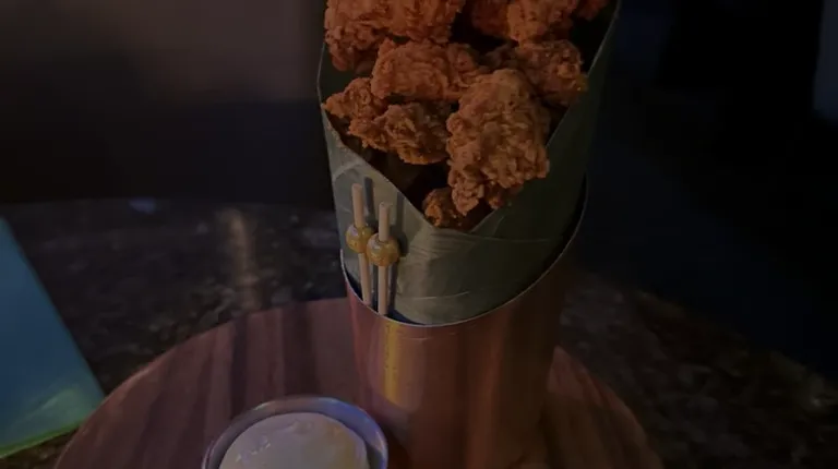 Flora Room is the newest speakeasy although some liken it to a cocktail lounge. Its located in the North Loop beneath Porzana's Argentinian steakhouse. Side street parking can be limited however there's valet & a parking ramp across the street. Every great speakeasy is a bit incognito. You can find the valet on the right side of the building, follow the ramp and continue to the back entrance. We arrived at 5:10pm and the place was already packed! Its the perfect spot for a date, solo, or girls/ fellas night out with it's dimly lit atmosphere with a mirrored backdrop at the bar. The florescent lit plant atrium is lined with top tables that seat up to 3 people. The coveted sage-green velour booths were snug for four of us, however we were comfortable. There is also seating down the middle, between the bar and atrium which is cozy. The swanky indoor atrium feel is what makes it a vibe along with the music and service. As self-proclaimed high-low girl, Flora's menu didn't disappoint. Food is served up until 12am and they offer shareable apps and a variety of cocktails.Food/Drinks 5/5 Alsace $19 | The Tuco Tuco $16 | Popcorn chicken $13 | French fries $9Chicken has a parmesan season/ fries we were shocked tbh. Even cold they were unmatched! Reminds me of Parlour fries! The star of the night: Not Fried Chicken Ice Cream $12 (vanilla, white chocolate, corn flakes).The chef included a Kit Kat in the middle for fun, it's flaky texture was savory while not being too sweet! Total: $80 (including the tip)The service was great the first time around with bartender being attentive and helpful with suggestions. Our second time was great then we switched booths where my friend didn't have such a great experience with the waitress when she requested a straw however she redeemed herself with shots for the table, a meeting of the minds and everything was smooth sailing moving forward. Flora is a vibe, if you're planning a trip, arrive early!