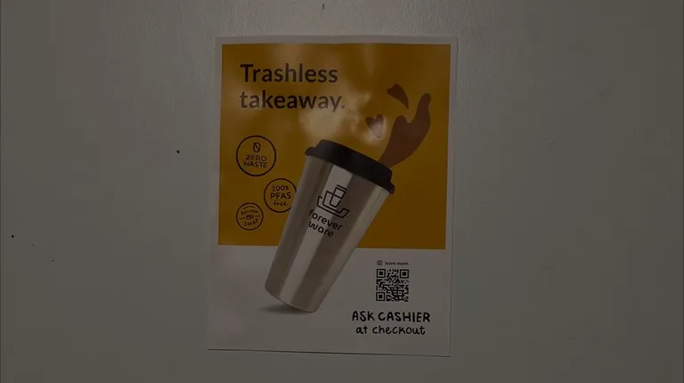 a cup of coffee with a sticker on it