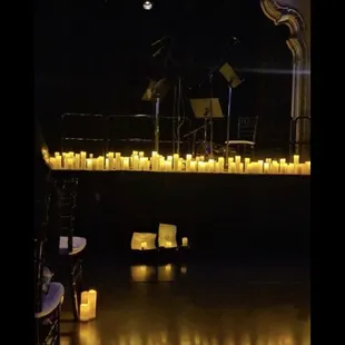 a stage with candles and a piano