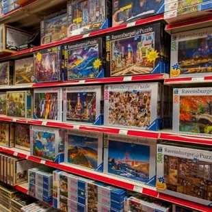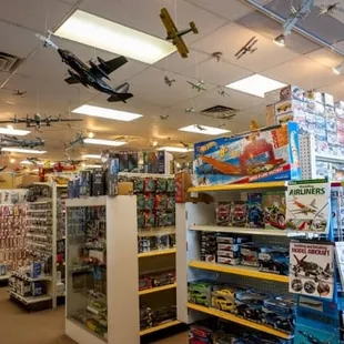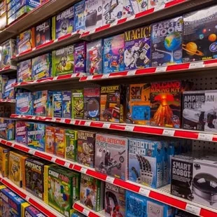 This is the nerdiest place with the most sweet customer service people ever! had taken a spiritual animal class and was looking for little zebras or butterflies. The female employee walked down aisle after aisle and showed me stuffed animals, stuffed animals on clearance, paint kits, scratch off waxy black metal thingy kits, animal figurines, paint by number animals. As we wandered about I saw tea sets for little kids, recycled plastic toy trucks, family games, the Pokémon cards my 12-year-old came here to buy, old fashioned car painting kits, make your own miniature toy train people and trees, I'm getting dizzy just trying to remember everything. This was a huge store. The male employee helped us find a bathroom and gave us a card for their other location and said they will happily transfer products between stores for us and was just overall super friendly and helpful. If my kids weren't teenagers who spend most of their lives on electronics, I would be here all the time!
