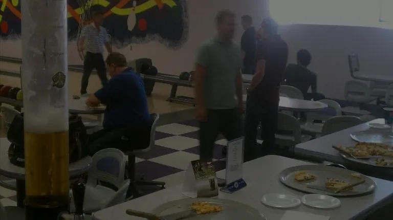 Our little company of IT geeks stopped in for a round of noontime bowling. Team building exercise! Yeah. The pizza was good ol' bowling alley pizza--delicious. Draft beer, pop. A nice bowling alley in a nice town. Thanks!