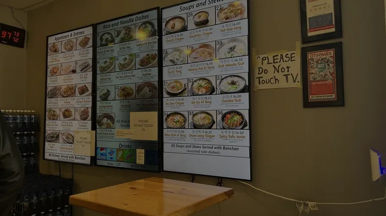 Counter service (that is really efficient). Great Korean food. Korean K-pop music videos playing on the large screen.