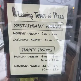 Happy Hour is goodPizza is not fantasticWill go back for sureIt's pretty much always Happy Hour at Leaning Tower, especially on the weekends. Nice to see. Most places are a short window M-F at the end of the workday. Lots of regulars. Two for one drinks on happy hour and two bucks off appetizers. Two complaints. The pizza is pretty much cheese and bread. Very minimal sauce. The other would be the very standard non-rotating beer selection. Staff is great and will continue to return if I don't get blackballed for this three star. Easy four if they work on my two gripes.