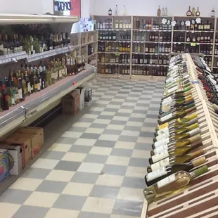 a wine store with a checkered floor
